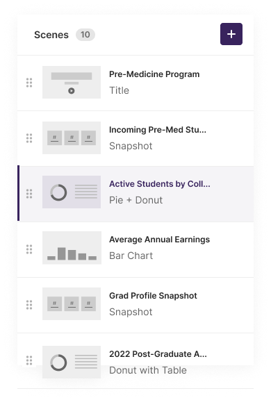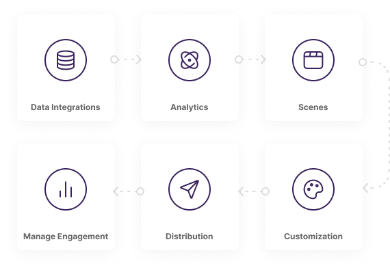 Storyline's episode builder leverages an expanding catalog of prebuilt analytics and scenes that can be assembled to create the right data-driven story for each targeted audience.