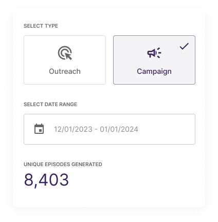 Storyline offers internal users to generate individual outreach episodes as well as batch generate up to thousands of episodes at the same time.
